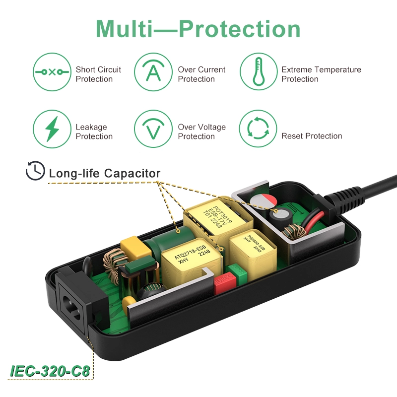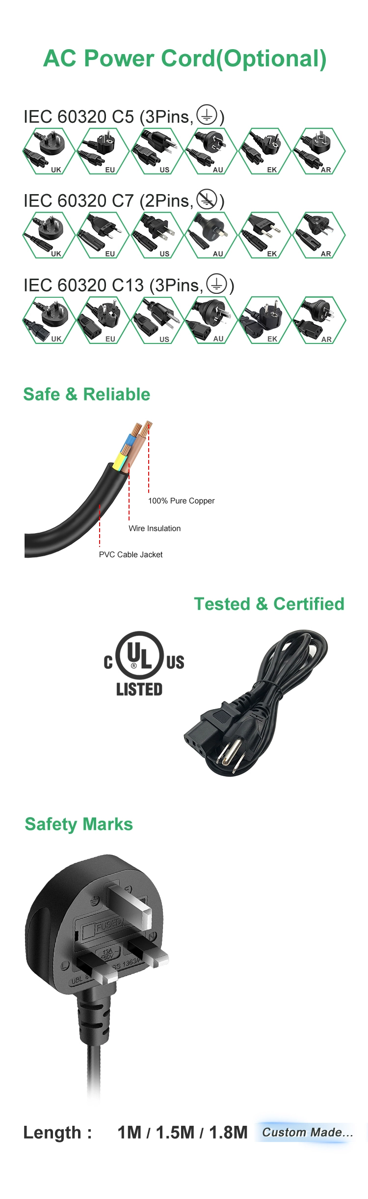 * Các thiết bị khác cho dòng 200W: có sẵn 5V/8V/9V/12V/13,5V/15V/18V/19V/24V/25V/30V/36V/29V/30V/42V/48V * An toàn: OCP/OVP/OTP, SCP, tự động ngắt quá tải, ngắt quá điện áp, ngắt nhiệt tự động. * Khả năng tương thích rộng rãi: Đèn dải LED, Máy in 3D, bộ thu phát vô tuyến ham, camera quan sát, bộ khuếch đại loa siêu trầm ô tô, bộ khuếch đại âm thanh, bộ định tuyến không dây, Mèo ADSL, Máy tạo độ ẩm, HUB, Bàn phím, Loa BT, Màn hình, Webcam, DVR, NVR, nguồn điện âm thanh/video